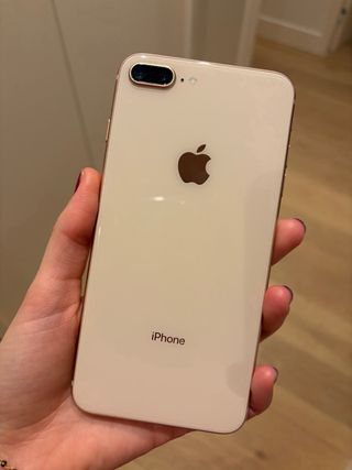 Telefono cellulare iPhone 8 Plus in colore oro e bianco. - Schermo da 5,5 pollici. - Fotocamera posteriore da 12 MP. - Pulsante home con Touch ID.