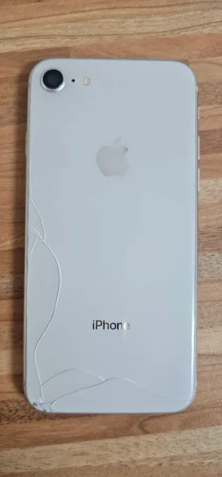 Telefono cellulare iPhone 8 in colore argento. Capacità di 64GB. Batteria da sostituire. Vetro anteriore rotto, necessita di sostituzione. Il cellulare funzionava ma è stato smesso di usare a causa del problema della batteria che non è mai stata sostituita.