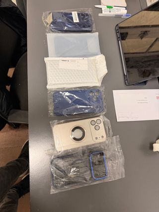 Set di cover per iPhone 12 Pro Max. Il pacchetto completo costa 8€, mentre ogni cover singola costa 1€. - Cover rosa peluda con decorazioni. - Cover rosa con protezione per fotocamera. - Cover viola con testo e protezione per fotocamera. - Cover bianca imbottita. - Cover fucsia liscia. - Cover argentata con brillantini. - Cover bianca imbottita con design a rombi. - Cover grigia con lettera 'S' e protezione per fotocamera. - Cover nera con stampa zebrata.