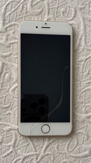 Telefono cellulare iPhone 6 in colore oro con 64 GB di spazio di archiviazione. Schermo da 4,7 pollici. Fotocamera iSight da 8 MP. Sensore di impronte digitali Touch ID. Schermo rotto ma non influisce sul funzionamento.