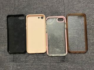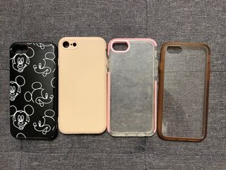 Lotteria di quattro custodie per iPhone 8. Presentano segni d'uso. - Custodia nera con stampa di Topolino. - Custodia rosa in silicone. - Custodia trasparente con bordo rosa. - Custodia trasparente con bordo marrone.