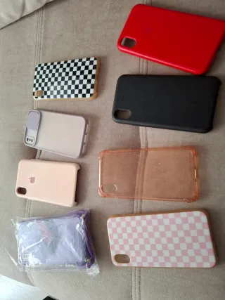 Set di 8 custodie per iPhone X. - Custodia a scacchiera bianco e nero. - Custodia rossa. - Custodia nera. - Custodia rosa antico. - Custodia trasparente con brillantezza. - Custodia rosa a scacchiera. - Custodia viola con cordino. - Custodia lilla.