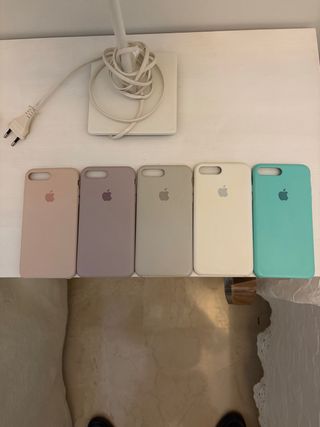 Varietà di custodie per iPhone 8. - Custodia gialla con logo Apple. - Custodia trasparente con design di gattina Marie. - Custodia rosa pallido. - Custodia trasparente con design di Minnie Mouse e glitter. - Custodia lilla. - Custodia verde con design di Stitch. Sono 7 custodie in totale a 10€ se le porti tutte e singole a 2€.