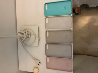 Set di cover per iPhone 8 Plus. - Cover con design astratto in rosa e verde. - Cover bianca con gatti e cuori. - Cover con design a righe in rosa e viola. - Cover liscia viola. - Cover nera con stelle. - Cover bianca con silhouette di gatto nero sdraiato. - Cover a tre pezzi, che si monta e protegge molto, copre fino allo schermo con una protezione in plastica, ha coperture per i pulsanti e per lo sportello del caricatore. Le vendo anche separatamente