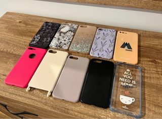 Confezione di custodie per iPhone 8 Plus. Varietà di design e colori per proteggere il tuo telefono. Tutte a 1€ - Custodia nera con design di Topolino - Custodia bianca con stampa floreale - Custodia trasparente con glitter - Custodia arancione con design di montagna - Custodia viola con stampa alla lavanda - Custodia rosa - Custodia beige - Custodia grigia - Custodia nera - Custodia trasparente con testo e tazza