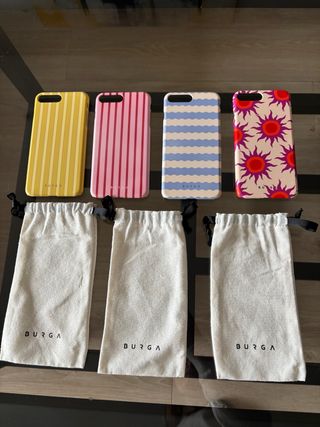 Set di fonine originali del marchio BURGA per iPhone 8. Tutte nuove. - Foina a righe gialle e bianche. - Foina a righe rosa e rosse. - Foina con design di onde blu e bianche. - Foina con stampa di soli rossi e viola. Prezzo in negozio: 50€ ciascuna. Le offro a 30€. Se le acquisti tutte, faccio un'offerta migliore.
