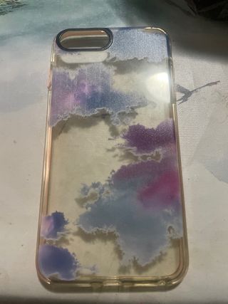 Custodia protettiva per iPhone 8 con un design di nuvole in toni di blu, viola e rosa. Il bordo è dorato. Design di nuvole. Bordo dorato.