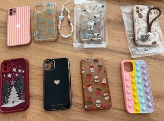 Set di 8 cover per iPhone 11 in buone condizioni. Include una varietà di design e colori. - Cover con stampa leopardo rosa. - Cover trasparente con bordo viola. - Cover con facce sorridenti rosa. - Cover verde liscia. - Cover gialla liscia. - Cover con design di cartoni animati. - Cover beige liscia con ciondolo. - Cover nera imbottita con dettagli dorati.