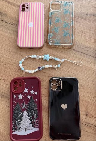Set di cover e accessori per iPhone 11. 8 cover per iPhone 11: - Cover trasparente con tartarughe marine. - Cover trasparente con Snoopy. - Cover trasparente con ricci. - Cover rosa a righe. - Cover bordeaux con design di alberi e stelle. - Cover nera con cuore e testo. - Cover trasparente con tazze da caffè. - Cover pop it multicolore. 2 catene 1 batteria esterna 1 caricatore supporto 3 caricatori (1 piatto, 1m e un altro 2m)