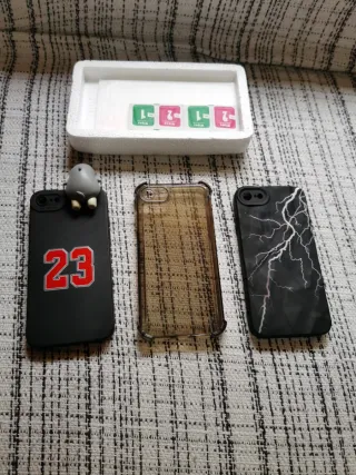 Set di tre custodie per iPhone 7-8-SE 2°Generazione 2020 e 2 proteggi-schermo. - Custodia nera con numero 23. - Custodia trasparente con texture. - Custodia nera con design a fulmine. - Include salviette per la pulizia del proteggi-schermo.