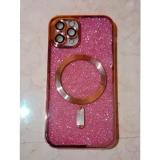 Cover per iPhone 11 Pro con finitura glitterata rosa. La cover presenta un design brillante e moderno. - Bordi color oro. - Anello magnetico integrato. - Dettaglio metallico. - Nuova ed imbustata.