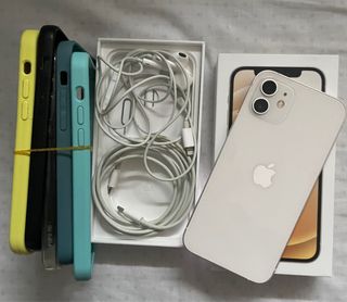 Vendo iPhone 12 bianco in buone condizioni, con accessori. Capacità massima della batteria al 69%. Include 5 cover di diversi colori (gialla, nera, blu trasparente e turchese). Cuffie originali Apple con cavo Lightning e caricabatterie. Prezzo negoziabile.