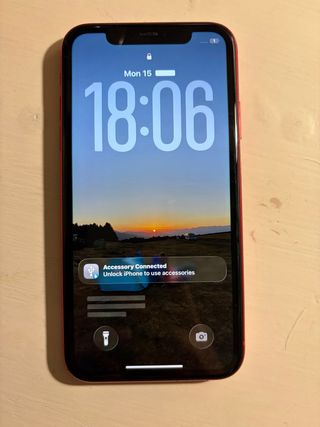 Telefono cellulare iPhone XR in colore rosso. Batteria: 88%. Schermo Liquid Retina HD. Chip A12 Bionic.