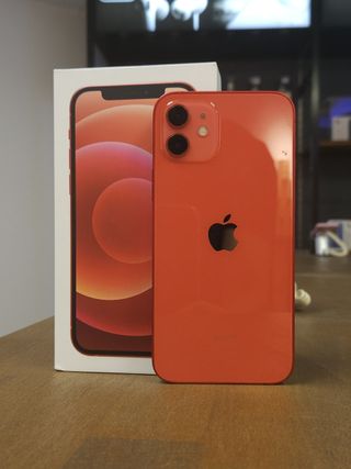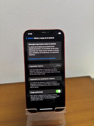 Telefono cellulare iPhone 12 in colore rosso. - Salute della batteria 76% - Schermo da 6,1 pollici. - Capacità di archiviazione 256 GB.