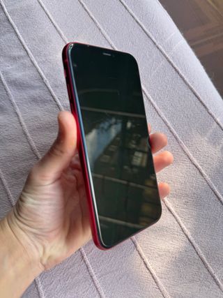 Telefono cellulare iPhone 11 in colore rosso. - Schermo da 6.1 pollici. - Sistema a doppia fotocamera. - Chip A13 Bionic. - Ha un piccolissimo segno, visibile lateralmente in una delle foto.