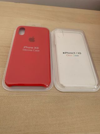 Due custodie per iPhone X e XS, una in silicone rosso e l'altra trasparente. Parte inferiore aperta. Fodera in microfibra. In confezione di plastica.