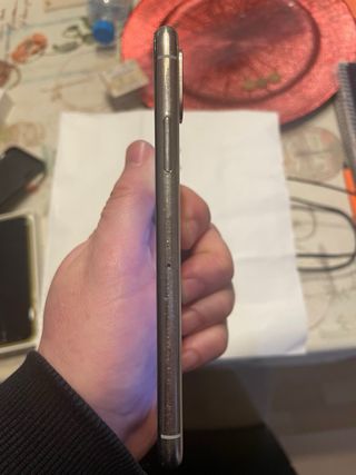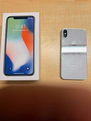 Telefono cellulare iPhone X. Colore argento e nero. Batteria al 70% della capacità. Ben curato ma la parte posteriore si è rotta. È un problema estetico, con la custodia non si vede. Si vende senza cavo di ricarica.