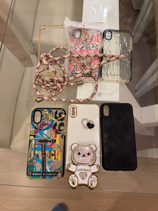 Lott di cover per iPhone X. Si vendono insieme o separatamente. Se separatamente, ciascuna costa tre euro. - Cover trasparente con cordino. - Cover con design graffiti. - Cover trasparente decorata. - Cover trasparente con fiori. - Cover con design orso. - Cover nera.