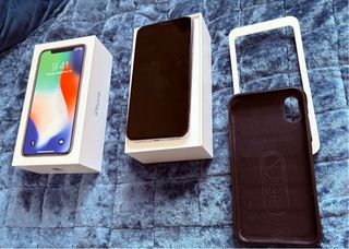 Telefono cellulare iPhone X. Batteria nuova. Scatola, cavo lightning, custodia protettiva, documenti e modello per posizionare il proteggi schermo in vetro temperato. In regalo un'altra custodia mimetica - Colore nero e argento.