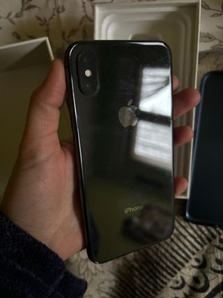 Telefono cellulare iPhone X con 64GB di spazio di archiviazione. Colore nero. Include la confezione originale. Due custodie incluse: una beige e una turchese. Batteria al 70%. Si accettano offerte.