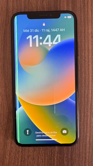 Telefono cellulare iPhone X con finitura nera e 256GB di spazio di archiviazione. - Schermo da 5,8 pollici. - Fotocamera doppia da 12MP. - Face ID per sblocco sicuro. - Include cavo di ricarica. L'unico difetto è lo schermo, che ha una decolorazione, con l'interfaccia di TikTok impregnata, come si può vedere in alcune foto, ma funziona perfettamente senza problemi al touch.