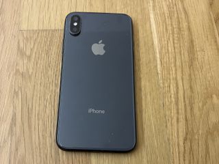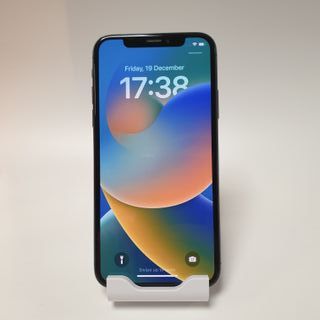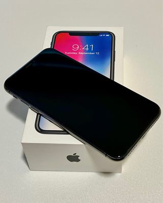 Telefono cellulare iPhone X con 64 GB di spazio di archiviazione. Colore nero. Include cavo e caricabatterie.
