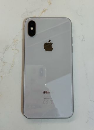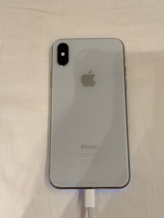 Telefono cellulare iPhone X con finitura argentata e 64GB di spazio di archiviazione. Ottime condizioni. Con segni di utilizzo. Scatola inclusa, senza caricabatterie. - Schermo Super Retina HD. - Chip A11 Bionic. - Fotocamera dual da 12MP.