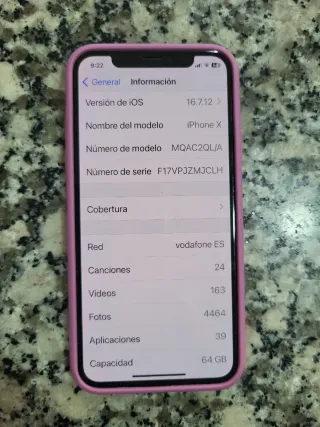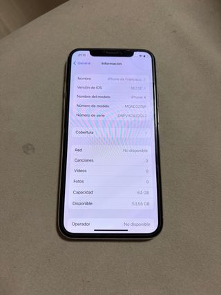 Telefono cellulare iPhone X con 64 GB di capacità. Vendo per passare a un modello superiore. Sempre con custodia e protezione per lo schermo. - Modello: iPhone X - Capacità: 64 GB - Versione iOS: 16.7.12 - Rete: libera - Numero di modello: - Numero di serie: