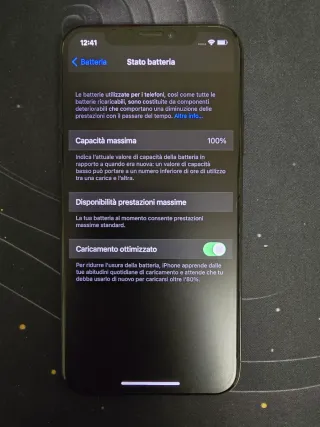 iPhone X in grigio siderale con 64GB di spazio di archiviazione. Capacità massima della batteria al 100%. Carica ottimizzata attivata per la cura della batteria.