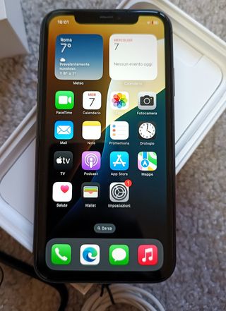 iPhone X colore Space Gray con scatola e caricatore originali. Modello da 64 gigabyte in condizioni estetiche eccellenti e perfette condizioni funzionali. NOTE IMPORTANTI: - La batteria è al 100%, NUOVA. - Monta una versione software rara: iOS 14.7.1 (mai aggiornato, molto ricercato dagli appassionati per Jailbreak).