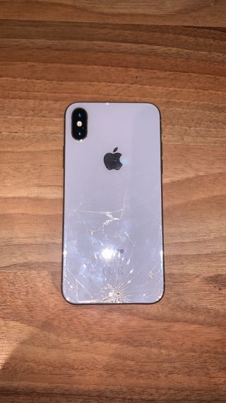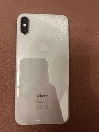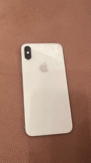 Telefono cellulare iPhone X in colore bianco. Presenta crepe sul retro e lo schermo frontale è allentato. - Schermo da 5,8 pollici. - Fotocamera doppia. - Capacità di 64GB.