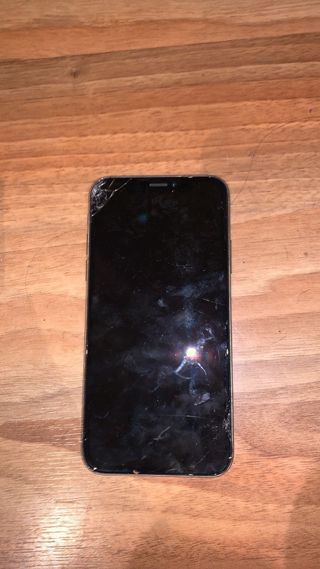 Telefono cellulare iPhone X per pezzi. Lo schermo è rotto. Colore bianco.