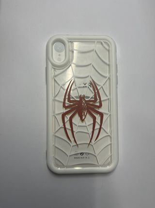 Custodia per iPhone XR con design Spiderman e ragnatela. Design trasparente con ragno rosso. Cornice bianca. Prodotto in Cina.
