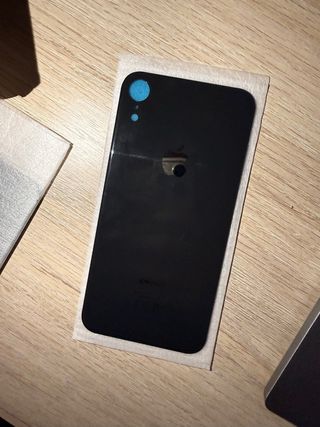 Ricambio per la copertura posteriore di un iPhone XR in colore nero. - Parte posteriore in vetro. - Logo Apple integrato. - Taglio per la fotocamera.