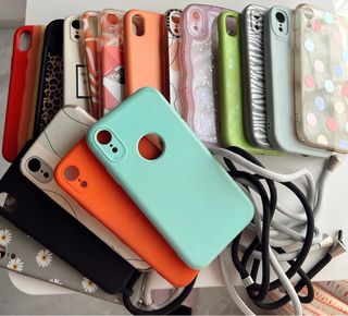 Set di cover per iPhone XR in buone condizioni. Include vari design per proteggere il tuo cellulare. - Cover rosa liscia. - Cover trasparente con frutta. - Cover bianca con fiori blu. - Cover trasparente con fiori rossi.