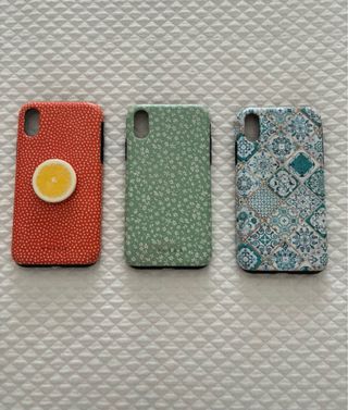 Set di tre custodie per iPhone XR. - Custodia rossa con pois bianchi e fetta di limone. - Custodia verde con stampa floreale bianca. - Custodia con design a piastrelle in toni di blu e bianco.
