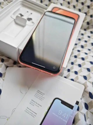 Telefono cellulare iPhone XR in colore corallo. Con scatola originale, cuffie e caricabatterie. Lo schermo è in buone condizioni e non presenta rotture (nelle foto sembra ma è una protezione per lo schermo) ha solo un piccolo graffio sulla custodia nella parte inferiore come si può vedere nella foto, stato della batteria 78% - Schermo da 6,1 pollici. - Fotocamera posteriore da 12 MP. - Fotocamera frontale da 7 MP.