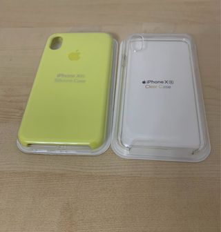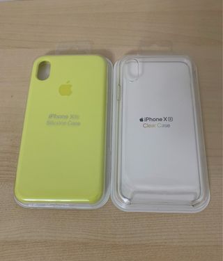 In vendita due cover per iPhone Xr: una in silicone gialla con fodera in microfibra e l'altra trasparente. La parte inferiore è aperta. In confezione di plastica. Mai aperta.
