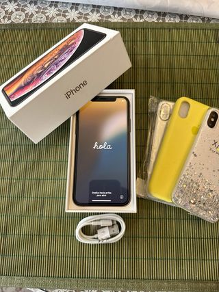 Telefono cellulare iPhone XS in colore oro rosa. Include la sua scatola originale e accessori: 3 custodie e il cavo di ricarica. - Custodia Apple gialla. - Custodia trasparente con glitter. - Cavo e scatola. 64GB. Il telefono non è mai stato aperto né sono state sostituite parti. È completamente originale.
