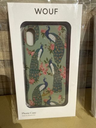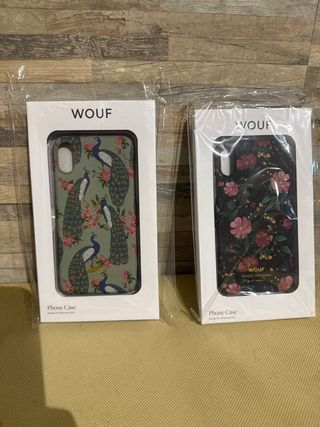 Due cover per iPhone X/XS del marchio WOUF con design esclusivi. - Cover con stampa di pavoni su sfondo verde. - Cover con stampa floreale in tonalità scure.