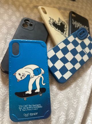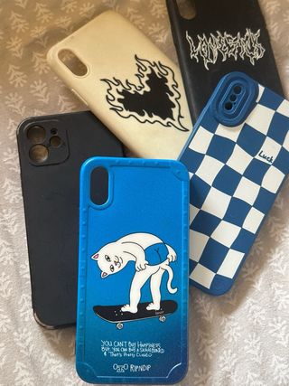 Set di cinque custodie per iPhone X e XS con design vari. - Custodia bianca con motivo di fiamme nere. - Custodia nera con motivo bianco in stile metallo. - Custodia blu con scacchiera bianco-blu e la parola Luck. - Custodia blu con grafica di un gatto che fa skateboard e il testo You Can't Buy Happiness But You Can Buy A Skateboard & That's Pretty Close e logo RIPNDIP. - Custodia nera liscia (questa ha i bordi scoloriti).