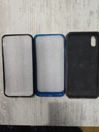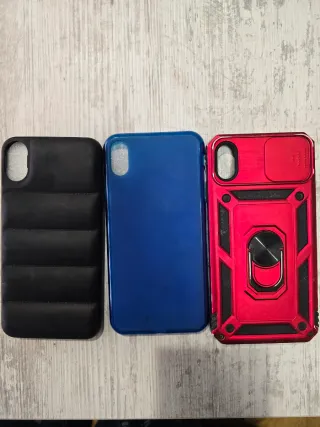 Confezione di tre custodie per iPhone. - Custodia nera imbottita. - Custodia liscia blu. - Custodia rossa con protezione per fotocamera e supporto anello.