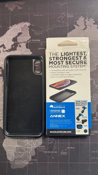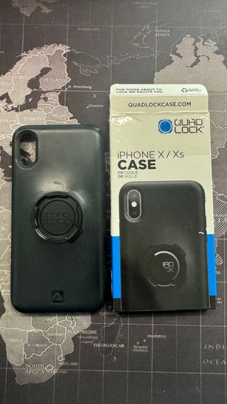 Custodia protettiva per iPhone X/Xs. Design nero. Meccanismo di montaggio Quad Lock integrato.