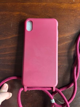 Custodia per iPhone XS Max in colore rosa fucsia. Include un cordino per portarla a tracolla. Materiale in silicone. Apertura per la fotocamera.