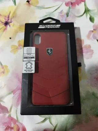 Custodia in pelle genuina per iPhone XS Max con il caratteristico design della Scuderia Ferrari. Colore rosso vibrante. Finitura imbottita a forma di V. Logo metallico Ferrari. Materiale: pelle autentica (Cuir véritable).