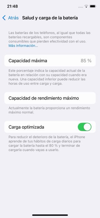 Telefono cellulare Apple iPhone in colore nero. La batteria ha un 87% della capacità massima. - Capacità massima della batteria: 87% - Ricarica ottimizzata attivata