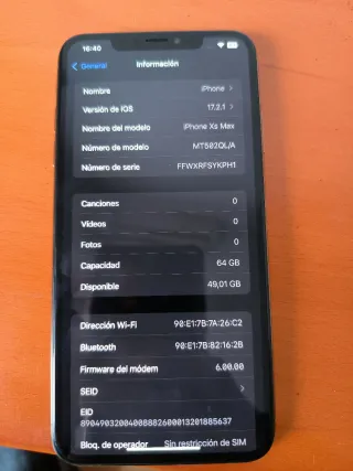 Vendo iPhone XS Max da 256 GB in colore oro in ottime condizioni e perfettamente funzionante. 🔹 Capacità: 256 GB 🔹 Modello: iPhone XS Max 🔹 Colore: Oro 🔹 iOS: 18.7.6 🔹 Spazio di archiviazione disponibile: più di 240 GB liberi 🔹 Salute della batteria: 74% (funziona bene, ma Apple consiglia il cambio per prestazioni massime) ✅ Schermo e fotocamere perfettamente funzionanti ✅ Ottimo stato estetico (vedi foto) ✅ Grande capacità di archiviazione Il telefono è stato ripristinato e pronto per l'uso. 📍 Spedizione tramite Wallapop. 💬 Per qualsiasi domanda, scrivimi senza problemi.
