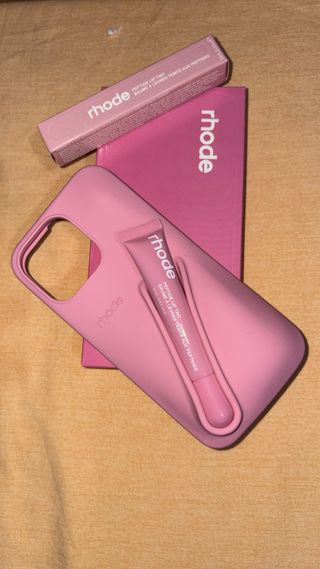 Cover per iPhone 16 Pro Max del brand Rhode, colore rosa. - Include un rossetto Rhode Peptide Lip Tint. - Materiale in silicone morbido.