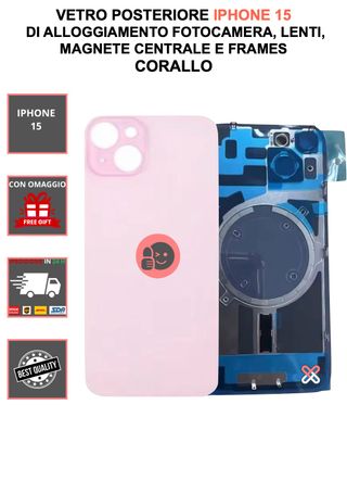 Vetro posteriore completo di ricambio per iPhone 15, colore corallo. - Include alloggiamento fotocamera, lenti e magnete centrale. - Spedizione in 24 ore. - Prodotto di alta qualità.