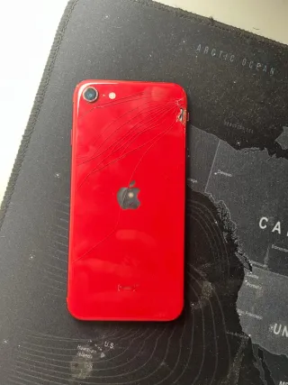 iPhone SE di colore rosso. - Schermo con crepe. - Angolo superiore destro danneggiato.